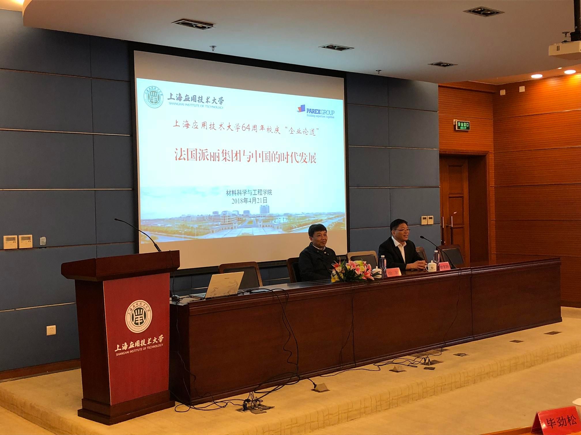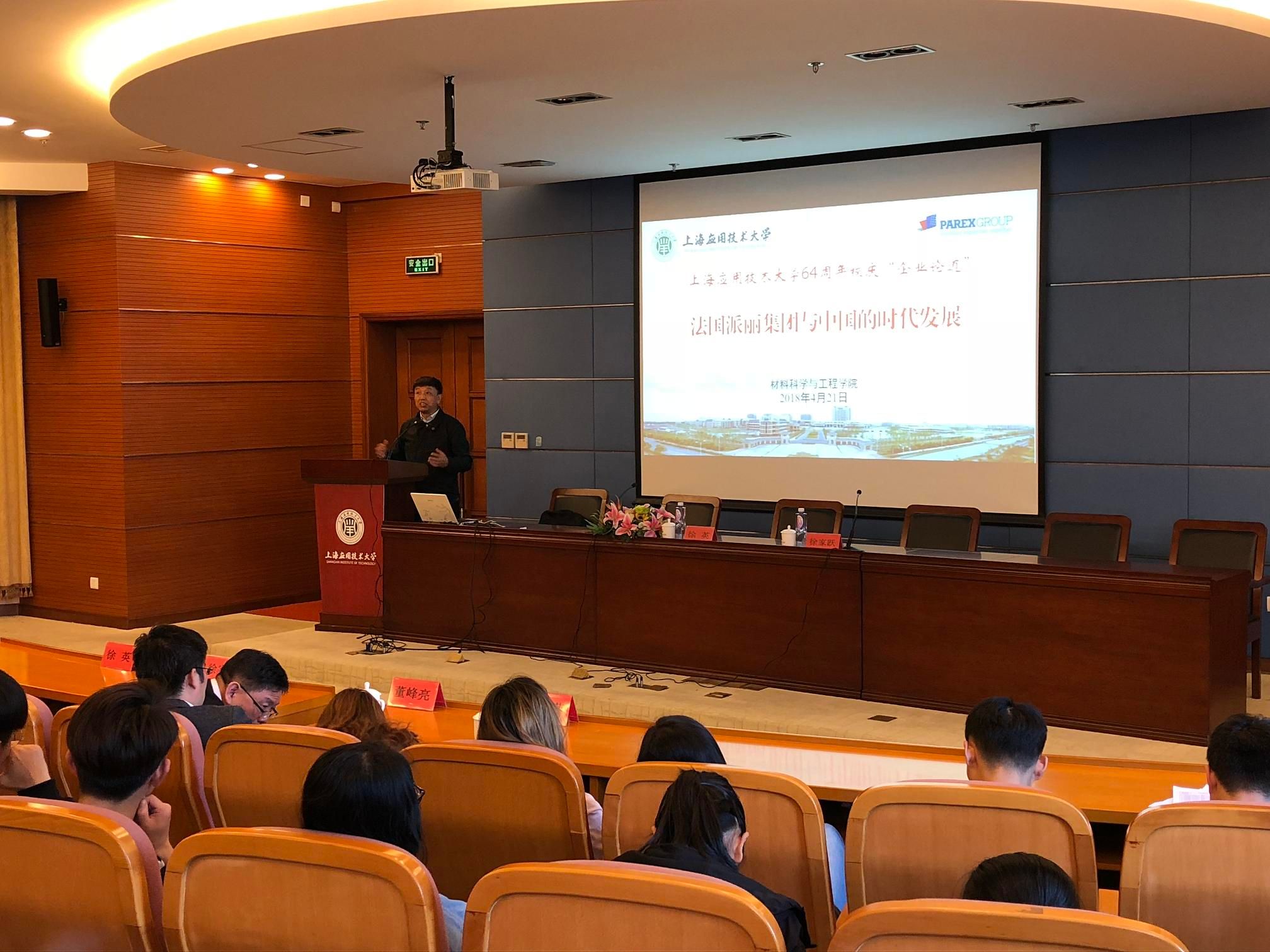4月21日下午,正值学校64周年校庆日,法国派丽集团全球副总裁、中国区总裁、执行董事徐英应邀到访我校,并为师生作了一场题为“法国派丽集团与中国的时代发展”的主题报告。报告会由校学术委员会主任、材料科学与工程学院院长徐家跃教授主持。法国派丽集团到访团队成员,材料学院党总支副书记、副院长毕劲松,副院长贾润萍等老师和学生参加报告会。