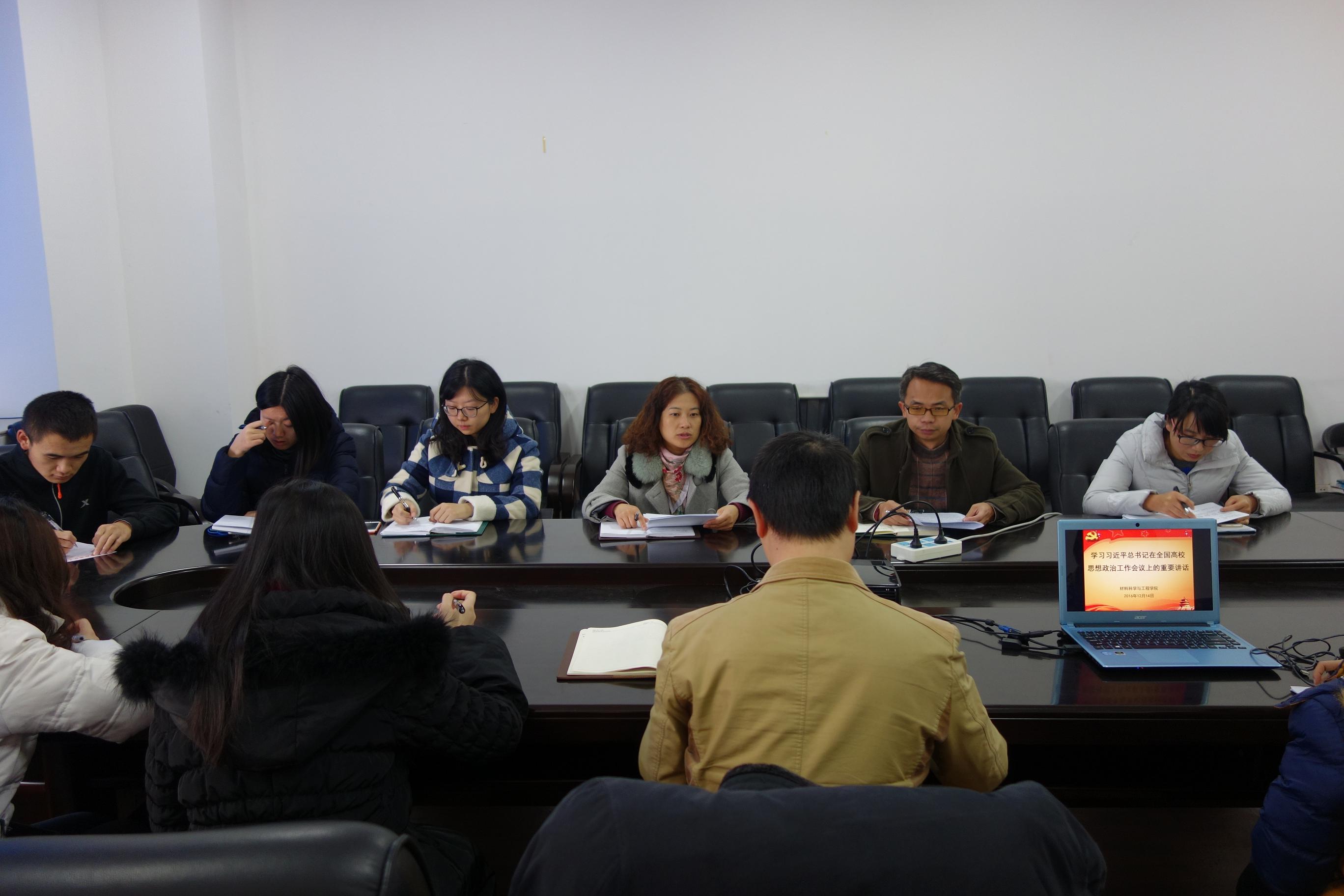 为贯彻学习习近平总书记在全国高校思想政治工作会议上的重要讲话,2016年12月14日,材料学院在第三学科楼A317召开学习习近平总书记全国高校思想政治工作会议上重要讲话座谈会。材料学院党总支书记田怀香、党总支副书记、副院长毕劲松,全体辅导员及研究生、本科生党员学生代表参加座谈会。