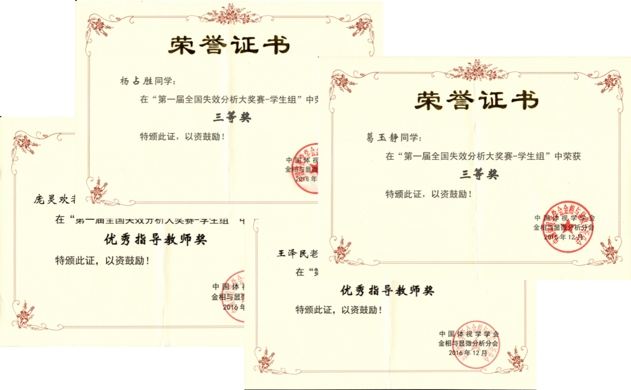 12月13-15日,由中国体视学学会金相与显微分析分会主办的第一届全国失效分析大奖赛在复旦大学举行。来自全国30所高校的38支比赛队伍同场竞技,比赛分由预赛、决赛两部分组成,主要针对机械构件在服役过程中产生的失效现象,进行分析寻求原因,提出解决方案。我校学子在比赛中发挥出色,答辩顺畅。最终,我校葛玉静、杨占胜同学分别获得三等奖,王泽民、庞灵欢老师获“优秀指导教师奖”。