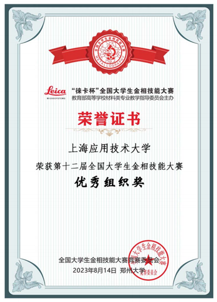 2023年8月9日至14日,经过持续近两个月的26场分赛区复赛的“徕卡杯”第十二届全国大学生金相技能大赛决赛在郑州大学举行。经过3天紧张激烈的比赛,材料学院谢海涛同学获全国二等奖,关伟、廖梦杰、潘进源、胡志伟、雷忠易等5名同学获全国三等奖。作为上海赛区的承办单位,上海应用技术大学荣获本届大赛的优秀组织奖。
