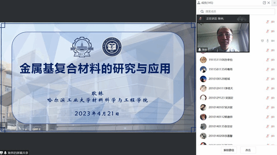 耿林教授现任哈尔滨工业大学材料科学与工程学院院长,兼任教育部高等学校材料类专业教学指导委员会秘书长,国务院材料科学与工程学科评议组成员,中国材料研究学会理事,黑龙江省复合材料学会副理事长。主要从事金属材料和金属基复合材料的设计、制备、微观组织、力学性能、成型加工和工程化应用研究,先后获得国家教学成果一等奖、黑龙江省科学技术奖一等奖2项,授权国家发明专利60余项,发表SCI收录学术论文400余篇。耿教授本次讲座以“金属基复合材料的研究与应用”为题,从金属基复合材料的制备与成型、组织与性能以及材料在航空航天领域的应用,为大家详细的介绍了金属基复合材料。讲座最后,耿老师耐心详细的为同学们答疑解惑,也非常欢迎感兴趣的师生日后赴哈工大进行学术交流。