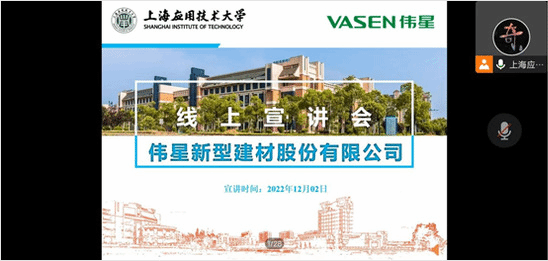 为促进2023届毕业生高质量就业,搭建毕业生与知名企业的沟通桥梁,增强毕业生对就业重要性的认识,了解行业企业用人要求,材料学院根据学校就业工作部署以及学院就业工作安排,于12月2日特邀伟星新型建材股份有限公司上海工业园办公室招聘专员齐亚磊、上海工业园人事主管朱潇以及上海工业园检测中心主任郭天钦为2023届毕业生作就业指导与招聘宣讲,现场提供多元化岗位,材料学院毕业班辅导员、全体毕业班就业学生参会。