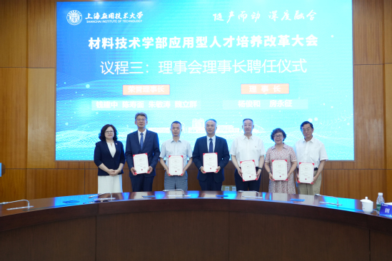 为充分彰显学校面向产业办学的决心,材料技术学部主动对接集成电路材料和智能制造等上海市行业协会和重点企业,聘请相关行业专家、企业代表、高校教授共同组成应用型人才培养改革理事会,全程指导并参与相关专业应用型人才培养;同时,学部打破学科壁垒,深化组织架构改革,在撤销原有系室的基础上成立集成电路材料产业学院和汇得材料智能制造产业学院,分别聘任行业专家和骨干教授担任产业学院院长和执行院长,具体负责应用创新人才培养改革方案的实施。大会上,陈海瑾为理事会荣誉理事长、理事长颁发了聘书,并向全体理事表示祝贺和感谢。材料技术学部主任房永征教授为产业学院院长、执行院长颁发了聘书,并见证产业学院的正式揭牌。