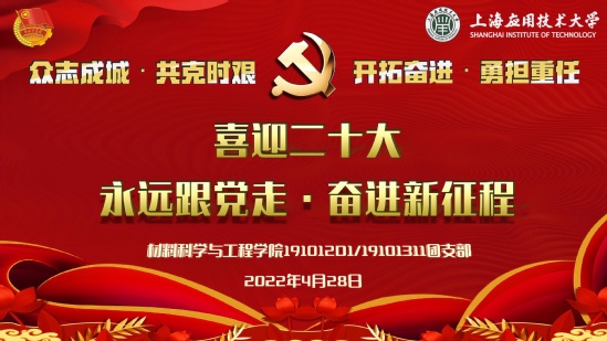 为迎接党的二十大胜利召开,庆祝中国共青团成立100周年,深入贯彻落实习近平新时代中国特色社会主义思想以及习近平总书记关于青年工作的重要思想,团结引领广大上应青年党员团员坚定跟党走、建功新时代,材料学院191012D1/19101311团支部于4月28日开展“喜迎二十大、永远跟党走、奋进新征程”主题云团日活动。上海应用技术大学党委副书记、校长柯勤飞应邀出席,材料科学与工程学院党委书记陈勇、党委副书记、院长杜永、党委副书记、副院长李婉,材料科学与工程学院2019级班导师、辅导员及191012D1/19101311联合团支部全体学生共同参加本次主题“云”团日活动。