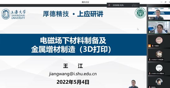 2022年5月4日,为进一步提升学术及科技创新能力,促进学科建设和专业发展,丰富学生的课余生活,材料学院特邀请上海大学王江教授、西南石油大学陈靖禹研究员,举办“厚德精技·上应研讲”系列讲座。此次讲座由材料学院院长杜永教授主持,相关领域教师和研究生共210人参加了此次线上讲座。