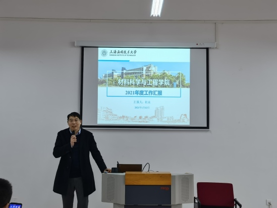 院长杜永作2021年度学院工作报告,总结了过去一年学院所取得的成绩,特别是实现了“六个一”的新突破:一个专业通过工程教育认证、一个博士学位点培育建设专项(材料与化工)获批、一个学科(材料科学)进入全球ESI排名前1%、一个省部级平台获批、一个国家重点研发计划获批、一批高层次人才计划获批。他代表班子衷心感谢大家的辛勤付出和努力,希望2022年全院上下团结一心推动学院更好地发展。