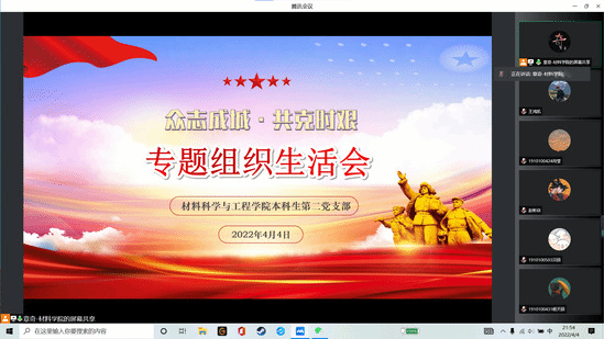 为了贯彻落实市委、市教卫工作党委有关精神和工作要求,进一步发挥党支部战斗堡垒作用,扛起特殊责任拿出特殊担当,材料科学与工程学院本科生第二党支部于4月4日采用云端形式开展“众志成城·共克时坚”抗疫先行专题组织生活会,从当前上海以及学校疫情防控面临的严峻形势进行全面介绍与剖析,使全体党员、入党积极分子深刻认识当前疫情防控的复杂性、艰巨性、反复性,并结合支部工作实际,讲清每个党员的责任担当和使命,带头加强对全体党员同志的正面舆论引导,从细从实带头做好疫情防控工作。