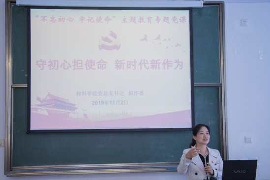 2019年11月2日,根据学校党委关于“不忘初心、牢记使命”主题教育的整体部署和工作安排,材料学院党总支书记田怀香结合之前的学习和调研情况,以“守初心担使命新时代新作为”为题讲授主题教育专题党课。材料学院全体教职工党员参加党课学习交流,学校主题教育第一巡导组组长薛纭应邀出席。