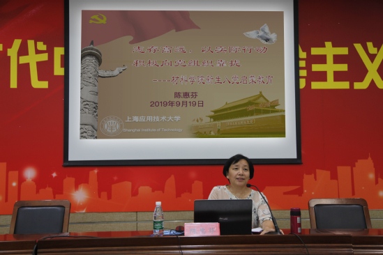 陈惠芬从“为什么大学生要积极加入中国共产党?”、“入党基本要求与程序”、“怎样写入党申请书”、“关工委在学生党建工作中的作用”四个方面展开讲述。她指出,新生申请入党的过程是接受教育和考察的过程,同时也是全面提高自身素质、促进自我全面发展的过程。她要求全体新生秉承“物成于材,人立于德”的院训,认真学习习近平新时代中国特色社会主义思想和十九大精神,以实际行动积极向党组织靠拢,做有远大理想、有家国情怀、有责任担当的材料人。