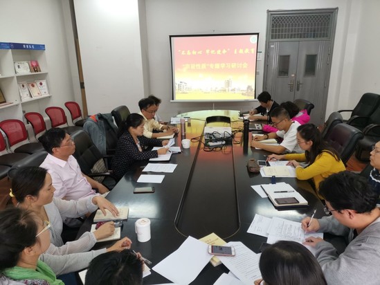 2019年10月8日,材料学院召开党总支扩大会议,进行“不忘初心、牢记使命”主题教育之“宗旨、性质”专题学习研讨会学习,材料学院党总支委员及各党支部书记参加本次专题学习,学校主题教育第一巡导组成员薛纭和朱丽娟老师应邀出席。