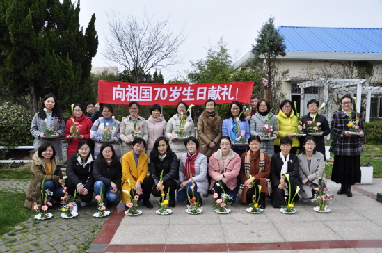 女老师们对插花表现出了极大的兴趣,在姜老师的指导下,大家边看边学,修枝剪叶,亲自动手完成了一件件精美的插花作品,看着眼前一盆盆色彩缤纷、形态多姿的艺术品,每个人的脸上都绽开了美丽的笑容,纷纷和自己的花艺作品合影留念,女教师们一起带着美好心情把这份美丽作品献给新中国70岁生日。