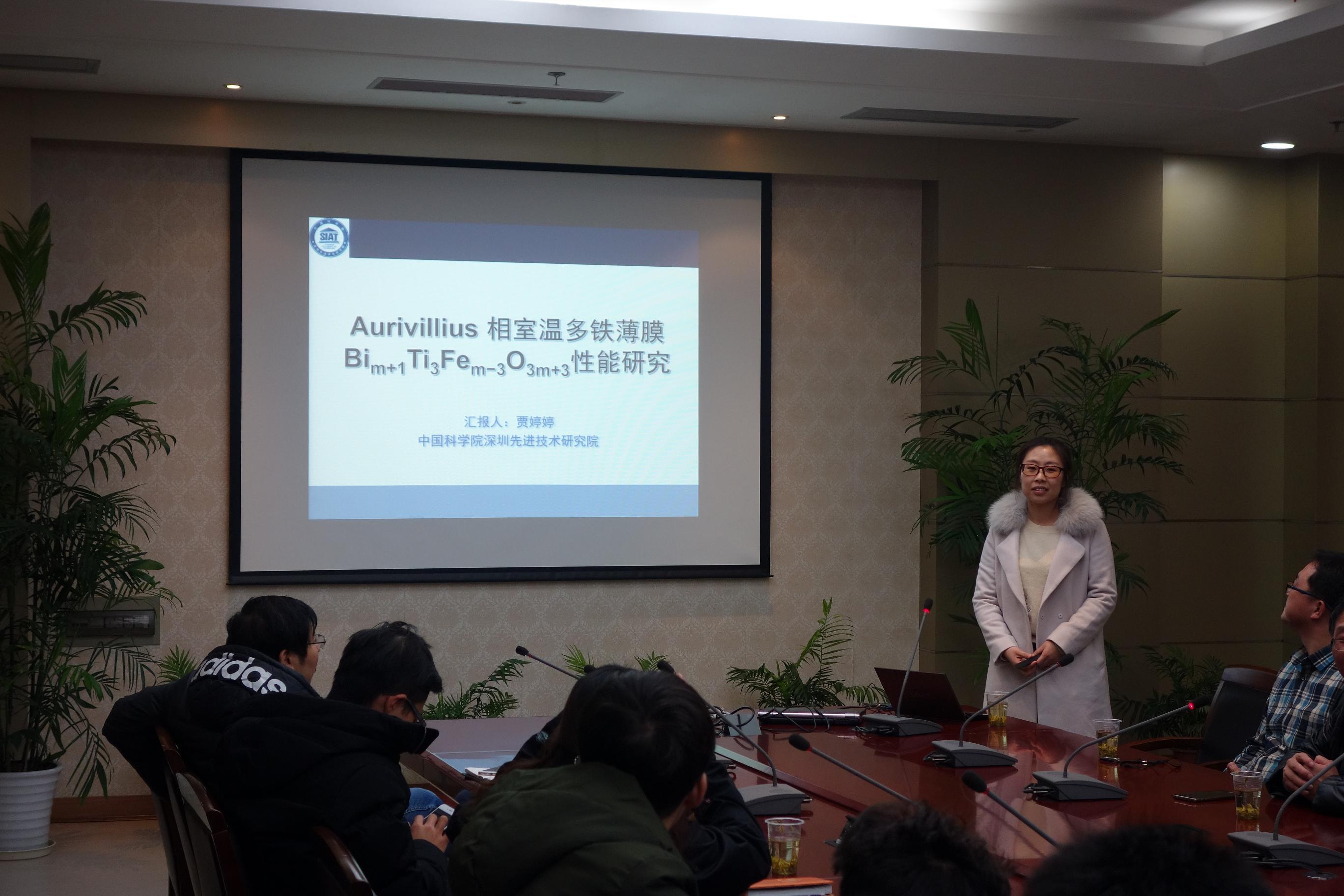 贾婷婷副研究员在报告“Aurivillius相室温多铁薄膜Bim+1Ti3Fem-3O3m+3性能研究”中介绍了课题组最新的研究成果“Aurivillius相结构的BTFO单相磁电薄膜材料”,并讨论了该材料的磁性和磁电耦合行为,该材料优良的铁电、铁磁特性达到了世界领先水平,未来在探测器、传感器、存储器和自旋电子器件等领域有着巨大的潜在应用。