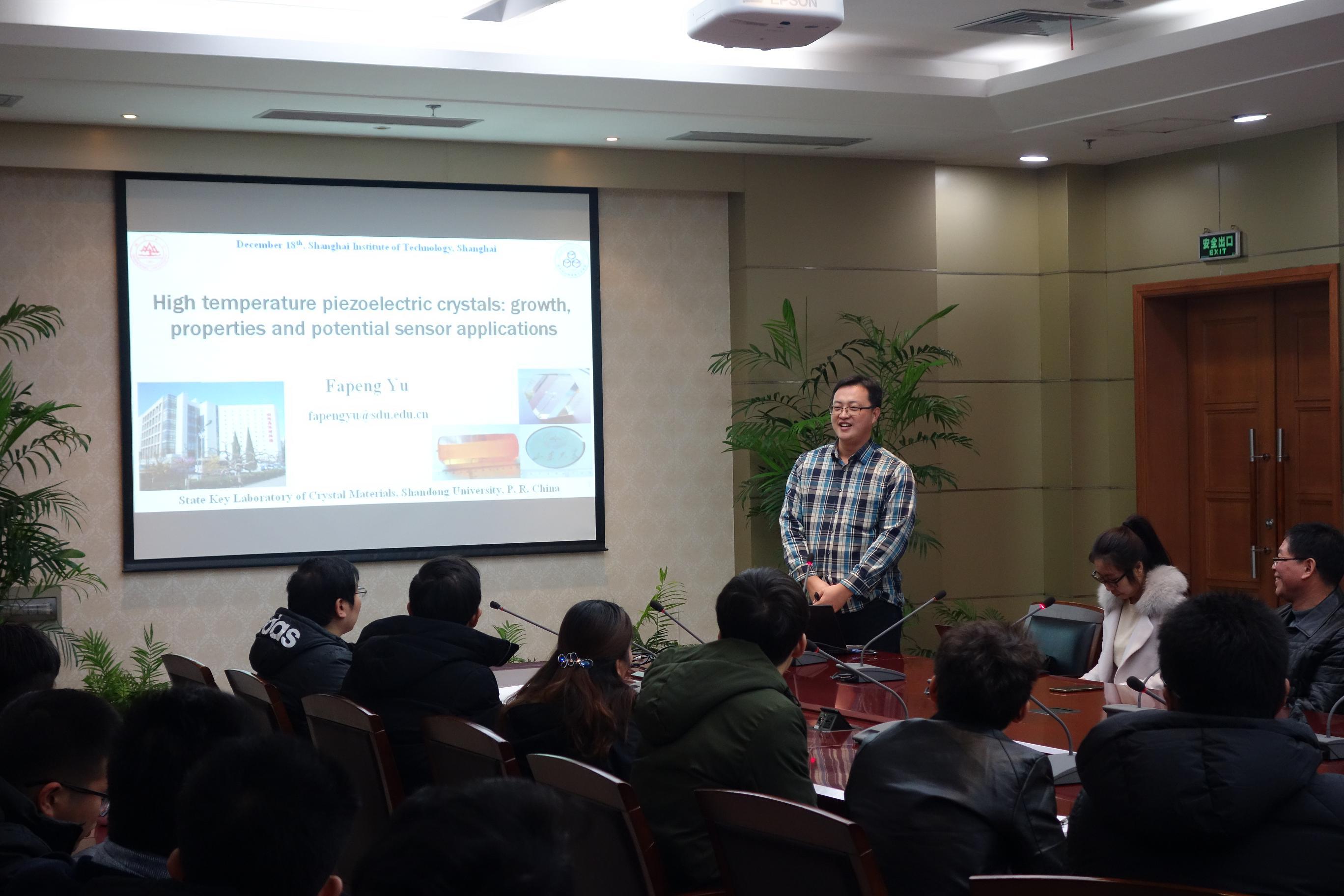 于法鹏副教授的讲座“High temperature piezoelectric crystals growth, properties and potential sensor applications”从压电晶体在传感技术领域的应用展开,对一系列应用于高温传感技术领域的压电晶体材料,特别是硅酸镓镧和稀土硼酸盐系列晶体的生长及性能表征进行了系统讲解。引起听众的热烈讨论。