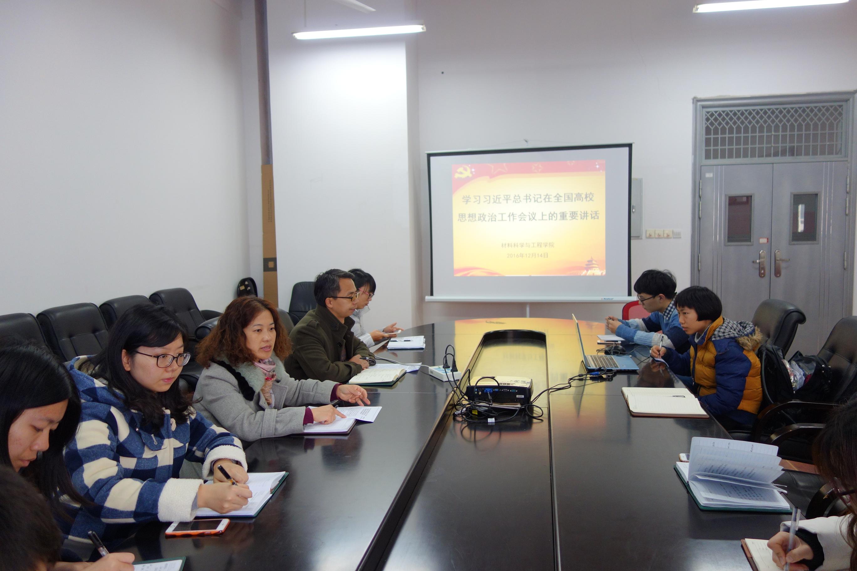 为贯彻学习习近平总书记在全国高校思想政治工作会议上的重要讲话,2016年12月14日,材料学院在第三学科楼A317召开学习习近平总书记在全国高校思想政治工作会议上重要讲话座谈会。材料学院党总支书记田怀香、党总支副书记、副院长毕劲松,全体辅导员及研究生、本科生党员学生代表参加座谈会。