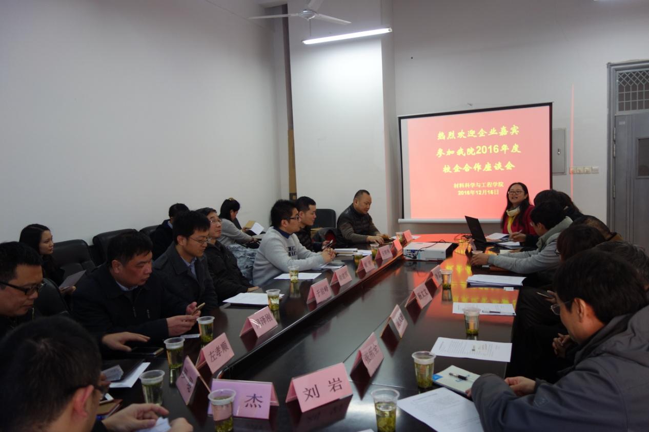 12月16日上午,材料学院2016年产学研工作会议在第三学科楼A317召开,材料学院党总支书记田怀香致欢迎词,教学副院长章冬云主持会议,副院长贾润萍、毕劲松参加会议。上海英科实业有限公司等十几家企/事业单位的领导出席会议,会上大家回顾了2016年产学研合作方面取得的成绩,并展望规划了今后的努力方向。