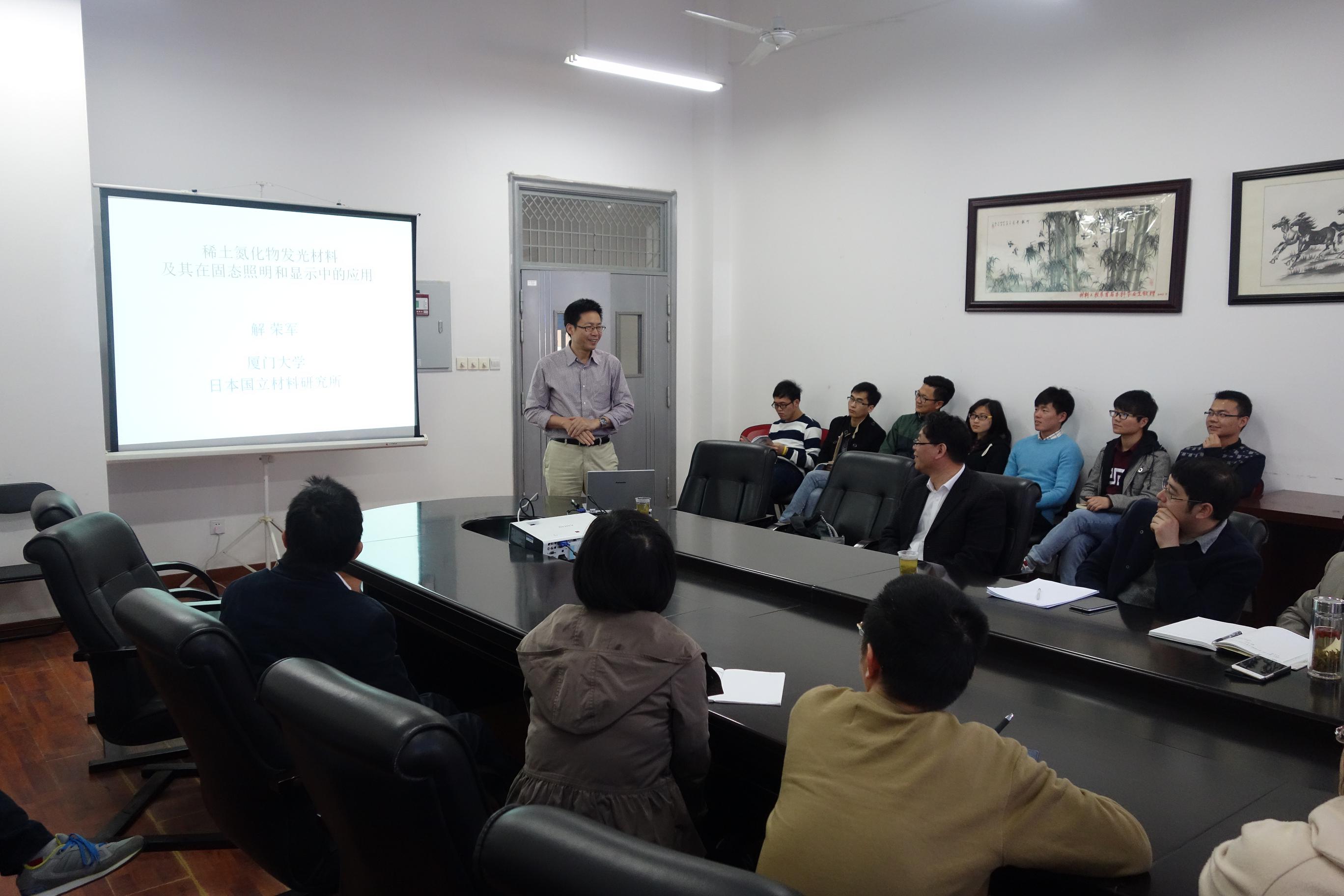解教授介绍稀土氮化物发光材料的发展历史、晶体结构和发光光谱,以及它们在固态照明和液晶背光源中的应用。此外,还介绍了最近开发的用于快速高效发现新型发光材料的单粒子诊断法。解教授的报告引起了与会师生的广泛兴趣,解教授逐一回答了大家的提问,与大家进行了深入的交流,报告取得了良好效果。