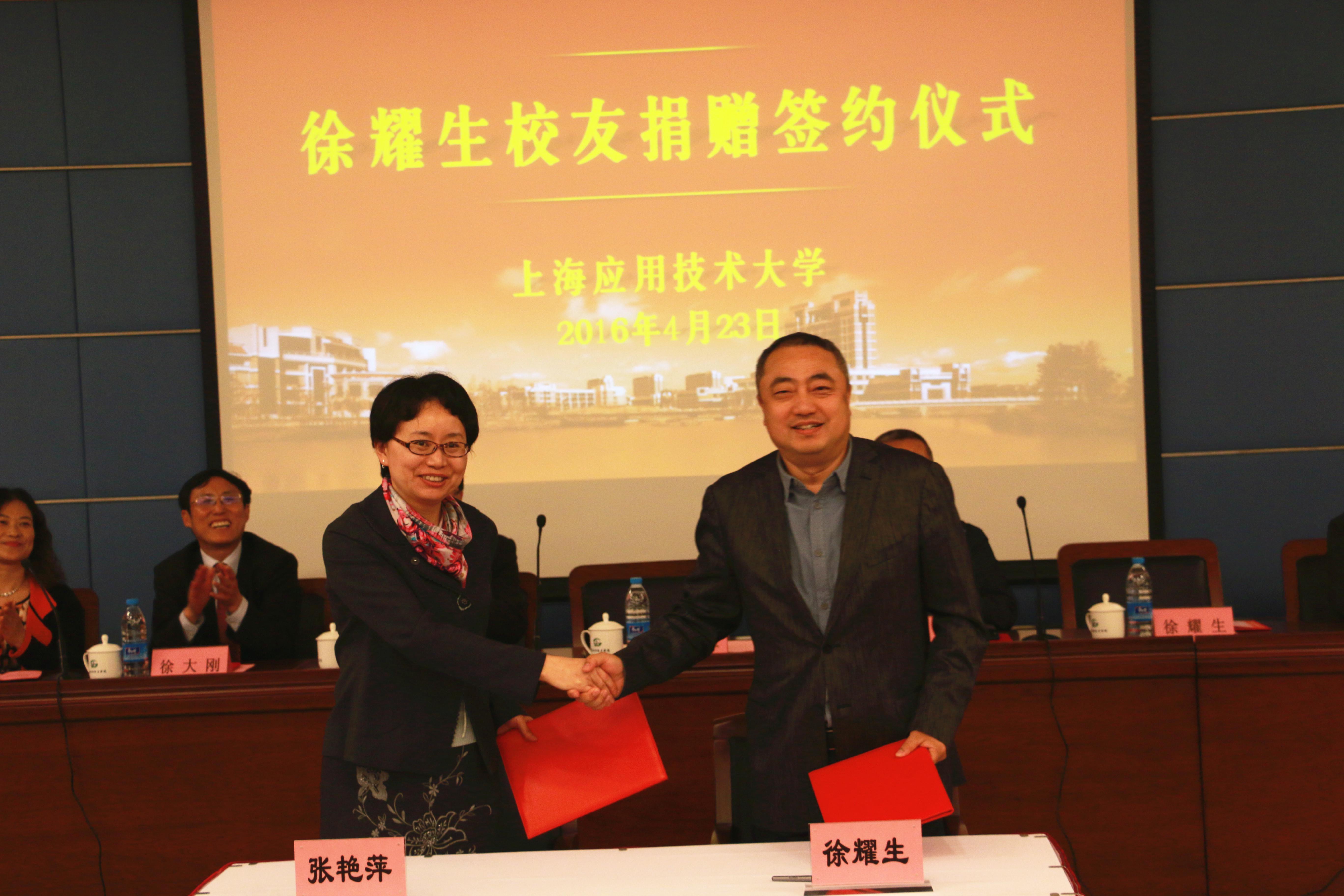 会上举行了徐耀生校友捐赠签约仪式,张艳萍代表校教育发展基金会和徐耀生校友签订捐赠协议。原冶专1983届校友徐耀生情系母校,特在母校62周年校庆暨上海应用技术大学揭牌之际,捐赠70万元给母校,其中,捐赠60万元(分三年捐赠)在母校设立“勤学基金”,专门资助上海应用技术大学里那些树立奋斗目标并坚持365天行动的学生,用以帮助学生养成良好的自主学习习惯和健康的生活方式,推动学生励志成才;徐耀生校友还捐赠10万元给他曾读书的系---现材料科学与工程学院,设立“心系母校校友奖助学金”,奖励和资助材料学院本科生。