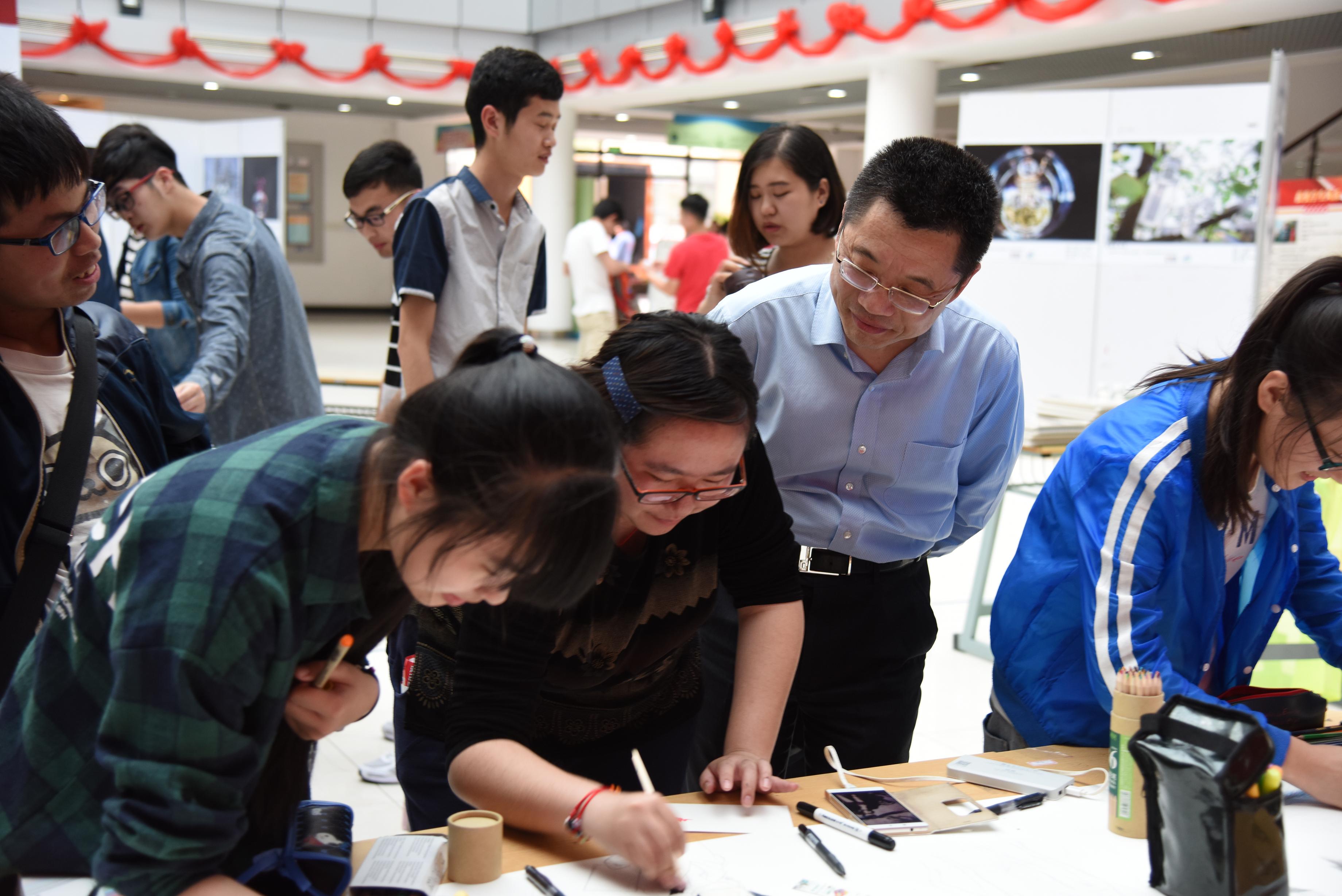 活动期间,陆靖校长亲临现场与同学们交流绘画及书法经验。陆校长鼓励同学们,要在学习知识的同时,不断提高自身艺术修养,争取早日成为优秀的应用技术型人才,为国家的建设添砖加瓦。同学们仔细认真地聆听陆校长的指导,活动现场气氛轻松活泼。