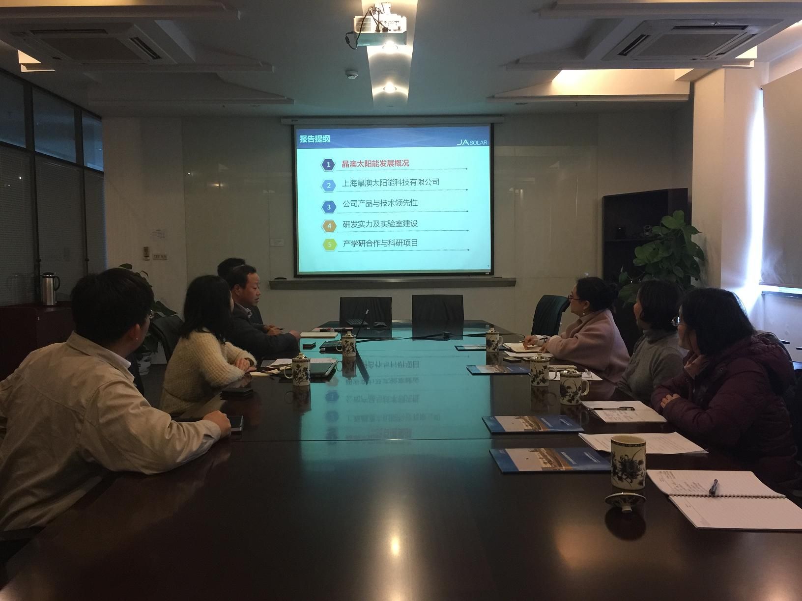 1月21日下午,材料学院陈惠芬副院长、章冬云副院长及材料物理(光电材料)专任教师共4人,一同前往上海晶澳太阳能科技有限公司,就全面开展产学研合作进行交流活动。上海晶澳太阳能科技有限公司黄健峰副总经理、人事部门经理、项目部门经理以及研发骨干给予了热情的接待。