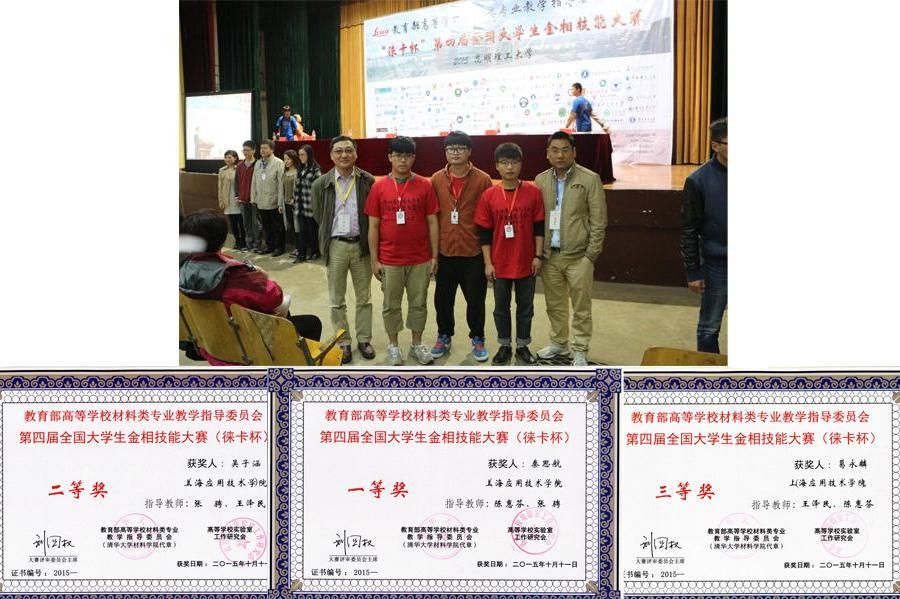 为备战全国大学生金相技能竞赛,材料学院得到了教务处的大力支持,由副院长陈惠芬和系主任张骋教授领衔、实验中心王泽民老师为主的指导团队,历经半年的校内选拔以及强化训练,最终我校选手在全国大赛中取得优异的成绩!