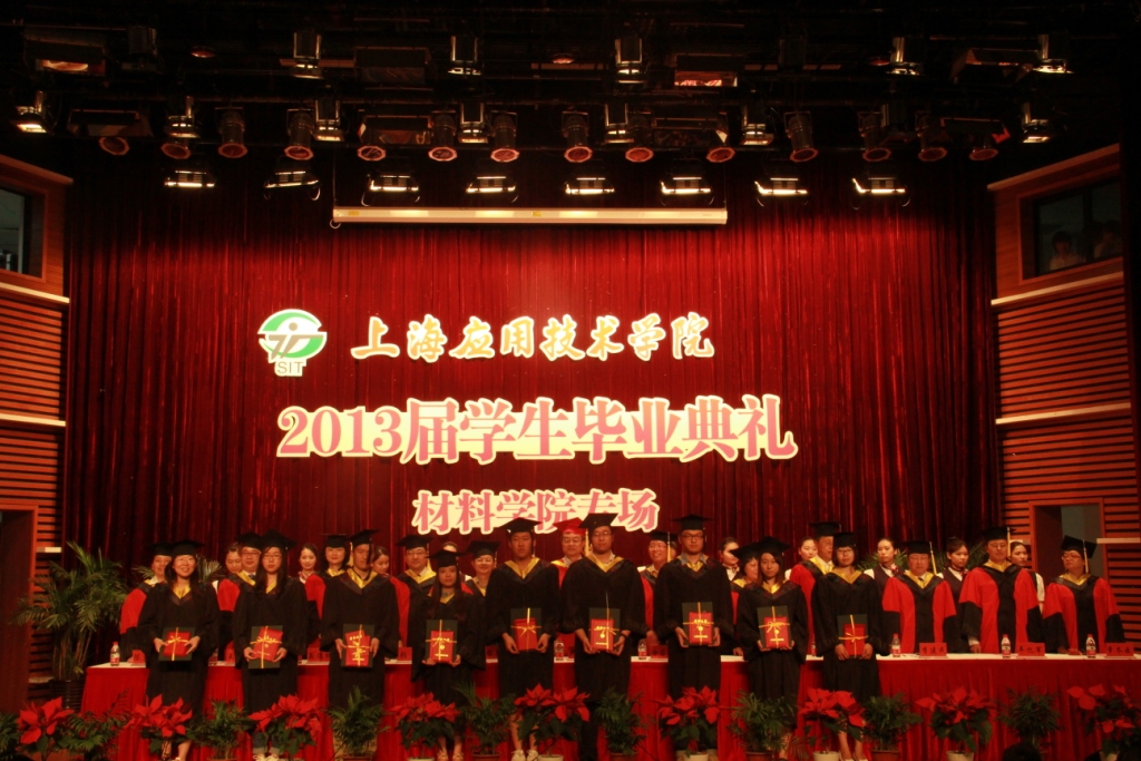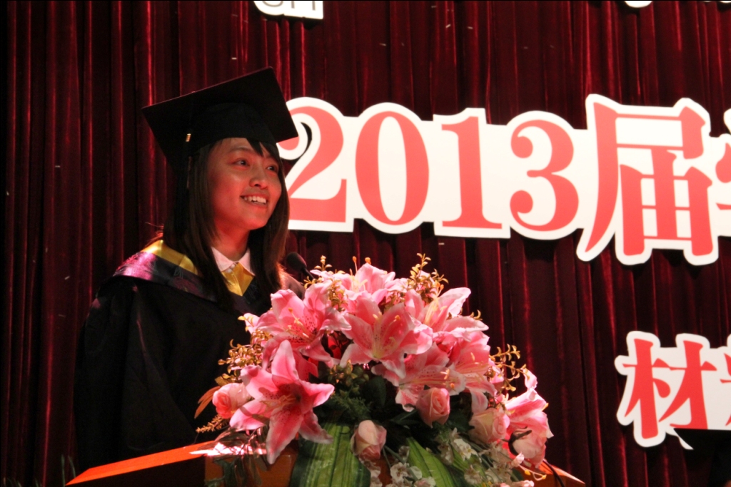 6月28日下午时分,学生活动中心二楼,通往多功能厅的走道上铺上了鲜红的地毯。会场入口处,矗立着高大的签名墙,毕业生、导师、嘉宾们走过红毯,都庄重地在上面签名并兴奋地合影留念。会场内,主席台上布满鲜花翠绿,专业礼仪分两则一字排开,摆出标准的欢迎仪态,大屏幕上反复播放着典礼议程,音响不断地播放着耳熟能详的《毕业歌》……材料学院精心筹备的2013 届毕业典礼将在这里隆重举行。