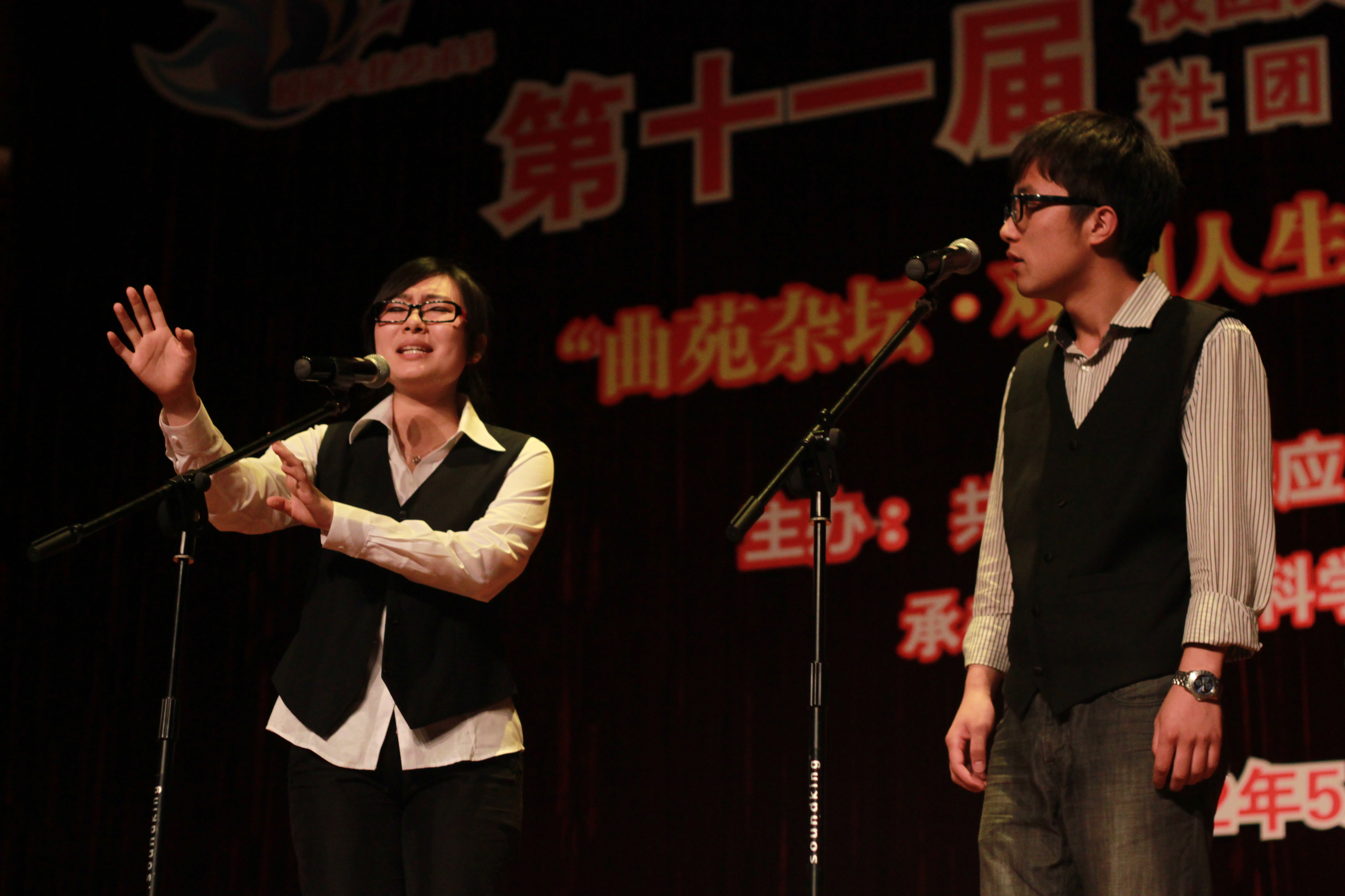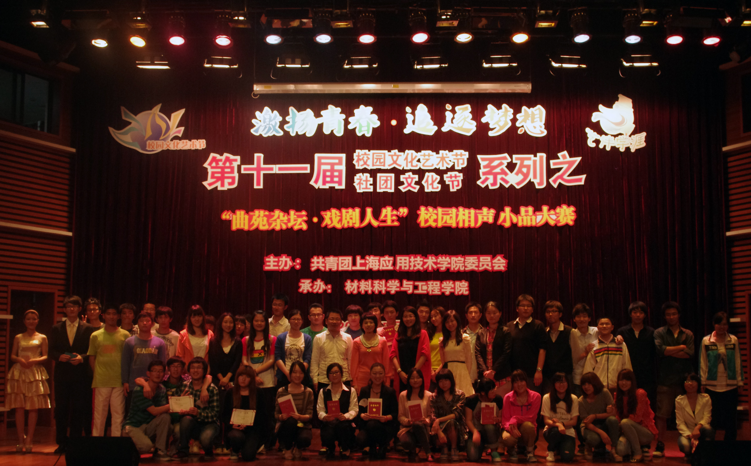 5月15日晚上6点,第十一届校园文化艺术节暨社团文化节系列活动之“曲苑杂坛•戏剧人生”相声小品大赛拉开帷幕。本场比赛由校团委主办,材料学院承办,校团委书记韩磊老师、材料学院党总支副书记、副院长王占勇老师出席本次活动并为获奖同学颁奖。