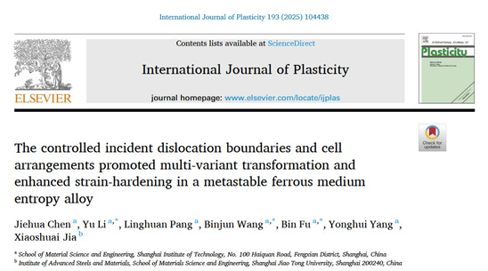 近期,我校黎雨副教授团队与上海交通大学科研团队合作在位错结构调控及低温强韧化机理取得重要研究进展,相关成果“The controlled incident dislocation boundaries and cell arrangements promoted multi-variant transformation and enhanced strain-hardening in a metastable ferrous medium entropy alloy”和“Influences of dislocation configuration and texture optimization on obtaining exceptional cryogenic strength-ductility synergy in a dynamic-recovered heterogeneous high-manganese steel”2篇论文连续刊登于国际顶级力学期刊《International Journal of Plasticity》 (中科院一区TOP期刊,IF = 12.8)。我校均为第一完成单位,硕士研究生陈杰华、熊昊为第一作者,黎雨、王斌君、付斌与上海交通大学李伟共同担任通讯作者。