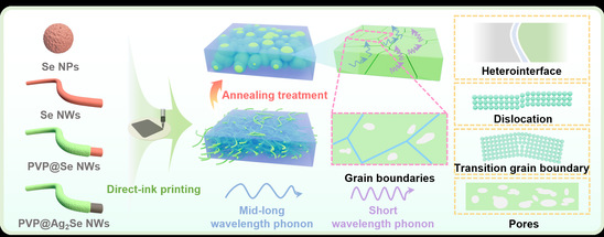 针对这一研究难点和热点问题,我校2023级博士研究生秦杰在导师的指导下通过溶液3D打印技术,成功制备出聚合物包覆的硒化银基柔性热电薄膜(图1),在400 K下功率因子达到2191.5 μWm-1K-2,刷新3D打印制备柔性有机/无机复合热电薄膜的最高纪录(图2)。这一突破源于对材料内部异质界面、孔隙、晶界与位错的协同调控(图3),实现了Seebeck系数与电导率的同步提升,并有效降低了热导率。同时,经1000次弯折后材料功率因子仍保持超93%,展现出优异的柔性。在材料研究突破的基础上,进一步利用溶液3D打印技术直接打印柔性热电器件(图4和图5),避免了传统工艺复杂的剪切、焊接、封装等步骤,显著提升了器件的制备效率,为柔性热电器件的规模化制造与产业化推广提供了一条新路径。