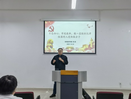 为引导入党积极分子坚定理想信念、强化组织纪律意识,10月20日,材料技术学部党委书记讲授了题为“不忘初心、牢记使命,做一名组织纪律性强的入党积极分子”的主题党课,材料技术学部党委副书记、副主任陈文博、各学生党支部书记、入党积极分子参加党课学习。
