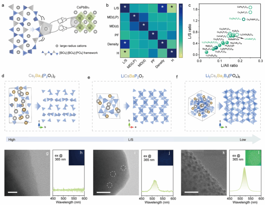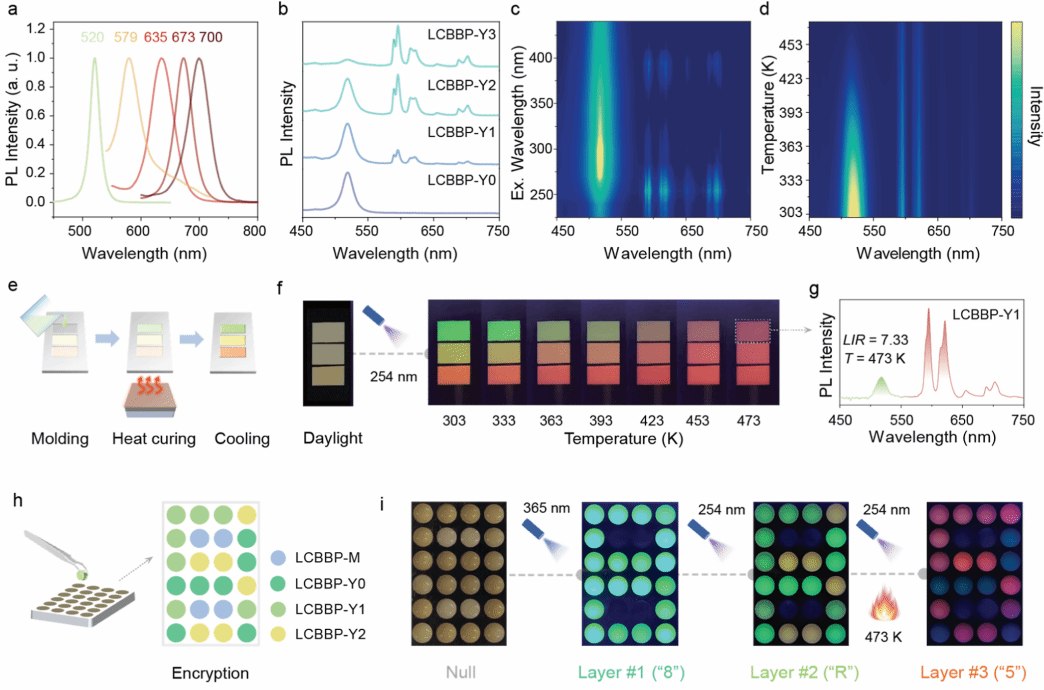 LCBBP - CPB 的多色调谐。(a) LCBBP -CsPbX3的PL光谱。(b) 254 nm激发下 LCBBP - CPB的PL光谱 (c) 室温下含10% Eu的LCBBP - CPB的激发波长依赖性PL光谱。(d) 254 nm激发下含10% Eu的 LCBBP - CPB 的温度依赖性PL光谱。(e) 由合成材料构成的比色温度计示意图。(f) 254 nm激发下的比色温度指示(303−473 K)。(g) (f)中虚线框标示样品的PL光谱。(h) 信息加密用LCBBP材料构成的像素化图案示意图。(i) 基于三组光子输出码在不同激发/温度参数下的解密过程。
