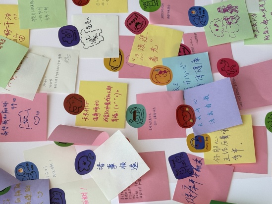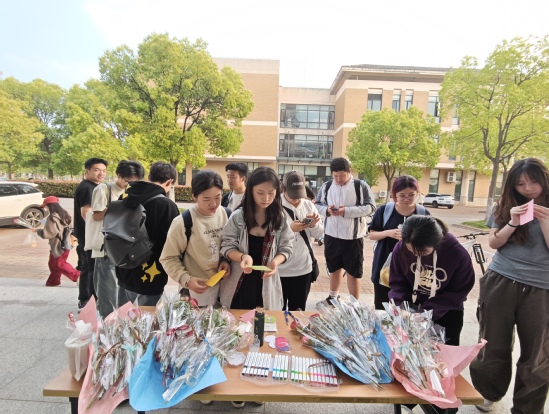 活动现场,长桌铺展成春日画卷——娇艳玫瑰、向日葵与雏菊错落绽放,搭配五彩便签与定制书签,吸引学子驻足凝望,同学们执笔轻书,将“愿考研顺利上岸”、“盼实验顺遂无忧”等心声化作纸间墨痕,或寄语未来,或感恩当下,每张便签皆成青春注脚。展板逐渐被暖心话语填满,似星河垂落人间;而换得花束的学子,手捧芬芳笑靥如花,一笺一束间完成情感流转。