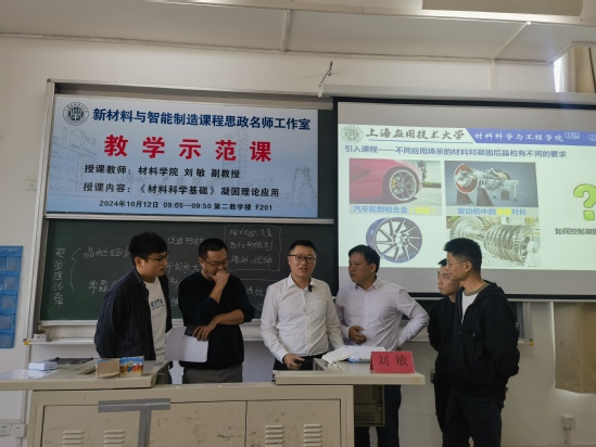 本次观摩的课程是由上海市第四届高校青年教师教学竞赛一等奖获得者、校新材料与智能制造课程思政名师工作室主持人刘敏副教授讲授的《材料科学基础》,该门课程为材料学院专业基础平台课,为上海市一流课程。刘敏自觉践行专业课程思政的要求,认真挖掘课程中蕴含的思政元素,以润物无声地形式有机融入专业教学实践中。在本次示范教学的课堂上,他以凝固理论在汽车轮毂用铝合金和发动机单晶叶片的应用为案例导入课程。在深入讲解晶粒细化原理与单晶制备技术等专业知识的基础上,他结合视频资源展示了单晶制备技术在光伏、芯片、航空、通讯等领域的重要应用,引导学生认识专业的价值与使命。同时,他还把我国科研工作者突破国外技术垄断,突破航空发动机单晶叶片核心技术,为我国航空和国防事业提供重要支撑的经典案例作为教学素材,既展示了我国航空制造业的先进成果,又勉励同学为我国科技自立自强做出自己的贡献。