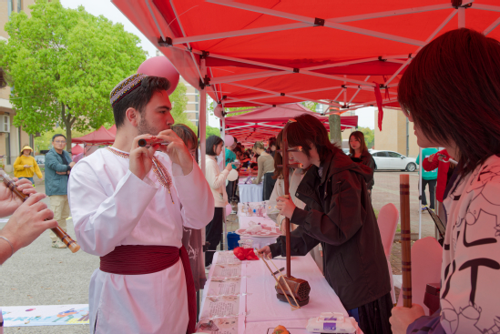 在乐器体验环节,参与者充满好奇地试玩着不同的乐器,一个个音符奏出了一首独特的交响乐;一些外国友人也被乐器独特的音色所吸引,兴致勃勃地前来了解乐器文化,并亲身体验;还有很多校友和同学现场表演起了自己擅长的乐器,吹笛子,拉二胡,悠扬的旋律回荡在校园上空。