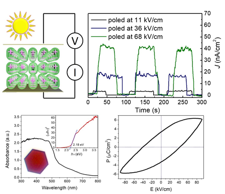 近期,我校房永征教授团队与上海材料研究所、华东师范大学合作,在新型窄带隙铁电光伏材料研究方面取得重要进展。通过水热法制备了新型高温铁电材料BaFe4O7微晶,样品具有极性三方结构(空间群:P31c)、可见光吸收(Eg ~ 2.18 eV)、在791 K附近表现介电弛豫行为、室温电滞回线、显著可见光光伏响应(Voc = 0.19 V,Jsc = 39 nA/cm2)。这一发现为探索不含挥发性元素的新型窄带隙铁电光伏材料提供了新路径,有望促进铁电材料在光伏应用方面的进一步发展。相关研究成果以“Visible-light photovoltaic effect in high-temperature ferroelectric BaFe4O7”为题发表于国际工程技术类TOP期刊Journal of Materials Chemistry C,(2020,doi.org/10.1039/D0TC03937C,SCI一区,影响因子:7.059),我校张刚华副研究员为第一作者,房永征教授为通讯作者。上述研究工作得到国家自然科学基金和上海市优秀技术带头人等项目资助。