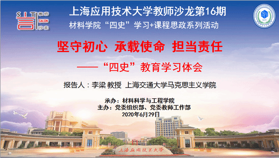 为了喜迎七一,落实校党委关于“四史”学习教育的工作部署,积攒奋进前行的精神力量。2020年6月29日,材料学院承办校第十六期教师沙龙,在图书馆B102举办了“四史”学习+课程思政系列活动之一,特邀请“全国优秀教师”、“全国高校优秀思想政治理论课教师”、首届全国高校思想政治理论课教学能手、2019年首届全国高校思想政治理论课教学展示活动特等奖获得者,上海市首批高校思想政治理论课名师工作室主持人---上海交通大学马克思主义学院博士生导师李梁教授作题为“坚守初心 承载使命 担当责任---‘四史’教育学习体会”的讲座报告。校党委组织部统战部部长王占勇教授、校党委教师工作部彭亚萍教授、材料学院领导班子成员,各党支部书记及部分教师党员、研究生党员参加座谈会和现场报告会,并邀请兄弟学院党员参加线下和线上会议。学院党委副书记、院长徐家跃教授主持讲座。