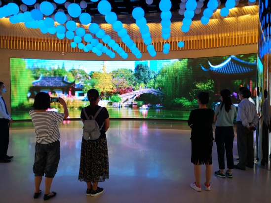 奉贤规划资源展示馆分三层,采用了数据流、全息、VR、AR等多种前沿科技,此次在解说员的专业讲解下参观了其中的一、二层。进门处的城市形象微电影让人仿佛置身于动感的城市现场。一层是历史城建篇,除了弧幕影院上演的奉贤历史回顾短片外,还有岁月遗珍展厅里的刻画精致的建筑模型。二层介绍了奉贤当下的规划发展,除了全息体验的杭州湾区域发展格局图,还有互动感很强的各镇风貌、形象片介绍及阅览区。