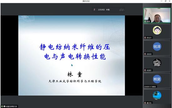 林童教授主要在静电纺、纳米纤维、功能性纺织品等领域从事研究工作,发表学术论文共340余篇,论文总引用超过2万次,H指数77,获批专利19项。曾主持和参与主持澳大利亚研究理事会科研基金项目13项,并承担多项横向课题,2009年当选为英国皇家化学学会会士,2020年当选为国际先进材料协会会士,2012年获澳大利亚研究理事会未来院士基金。林童教授以“静电纺纳米纤维的压电与声电转换性能研究”等主题,介绍了静电纺纳米纤维的相关前沿材料、声电转换的研究进展及其在声音发电、噪音发电等方面的应用前景。